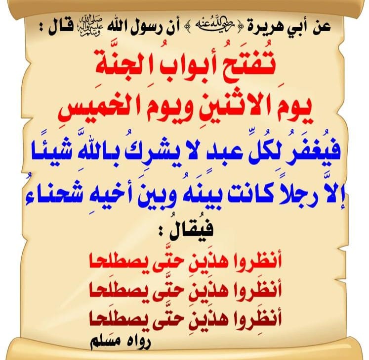 تُفتَحُأبوابُ الجنَّةِ يومَ الاثنينِ و الخميسِ، فيغفرُ اللهُ عزَّ وجلَّ لِكلِّ عبدٍ لا يُشرِكُ باللهِ شيئًا، إلَّا رجلًا كانَ بينَه وبينَ أخيهِ شحناء، فيقول: أنظروا هذينِ حتَّى يصطلحا، أنظِروا هذينِ حتَّى يصطلِحا ،أنظِروا هذينِ حتَّى يصطلِحا -أخرجه مسلم (2565)